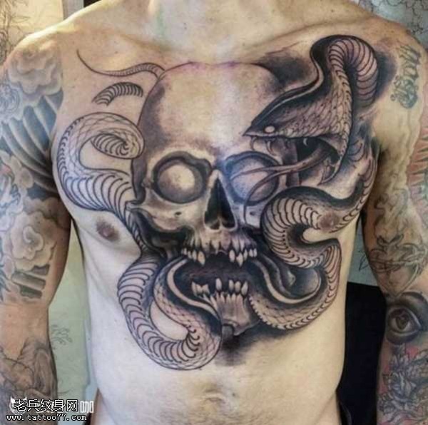 超帅时尚的黑灰骷髅与蛇纹身图案