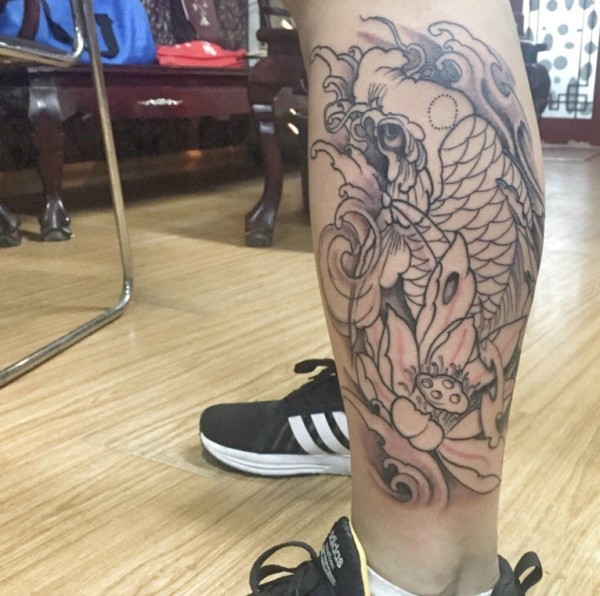 传统鲤鱼花小腿纹身_腿部纹身图案大全_纹身图吧