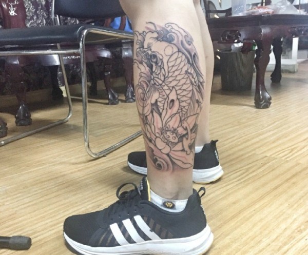 传统鲤鱼花小腿纹身_腿部纹身图案大全_纹身图吧