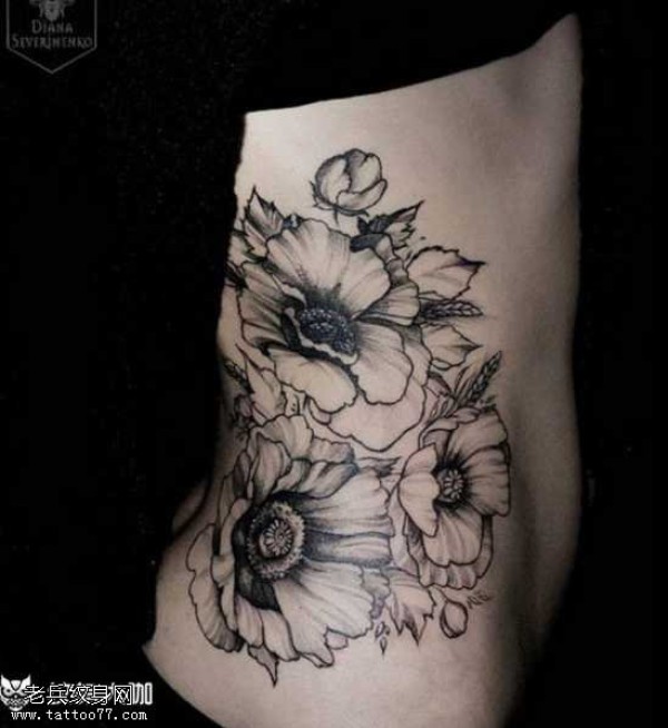 腰部黑色花朵纹身图案