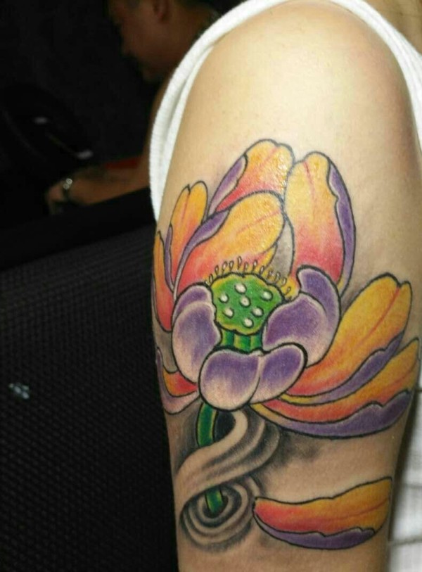 大臂彩色莲花纹身图案精致漂亮
