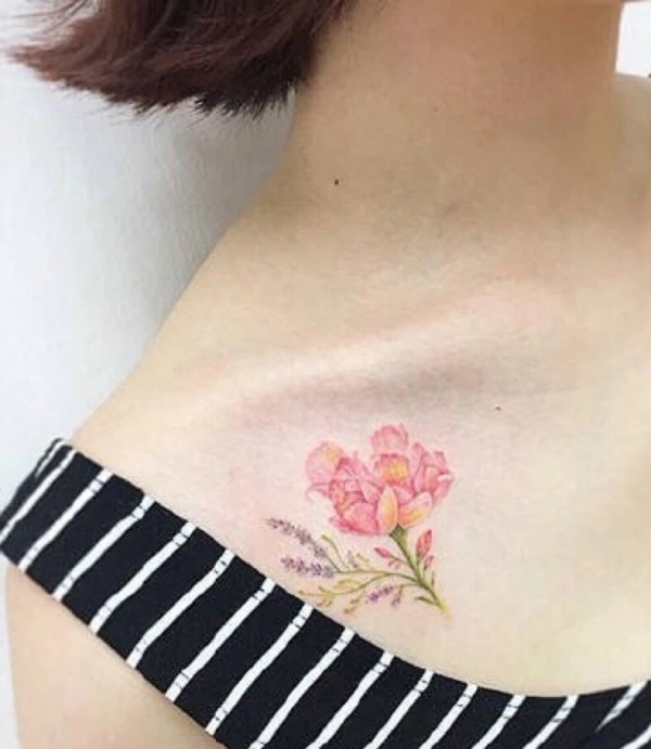 短发女孩锁骨处小清新花朵纹身图案