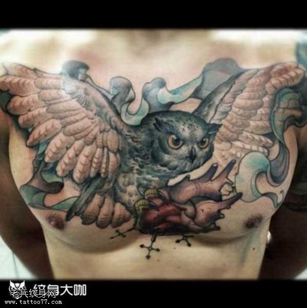 胸部猫头鹰心脏纹身图案