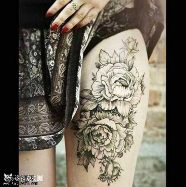 腿部个性玫瑰纹身图案