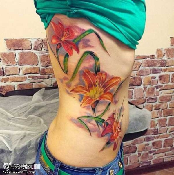 腰部彩百合花纹身图案