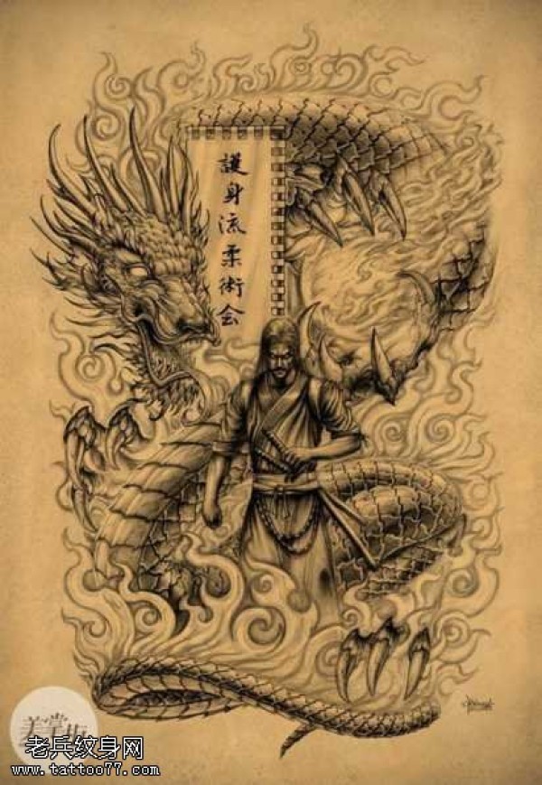 龙纹身手稿_一组老传统黑灰龙手稿纹身图案