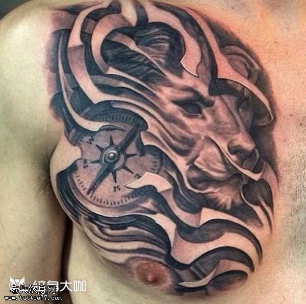 胸部狮子闹钟纹身图案