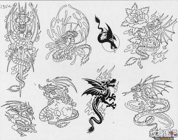 龙纹身手稿_一组老传统黑灰龙手稿纹身图案