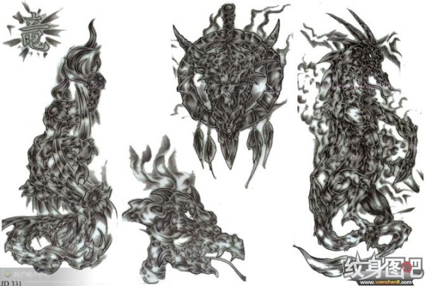 龙纹身手稿_一组老传统黑灰龙手稿纹身图案