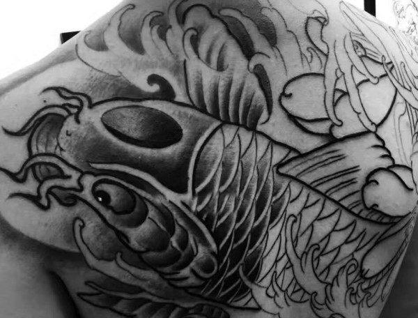 满背黑白传统大鲤鱼纹身图案