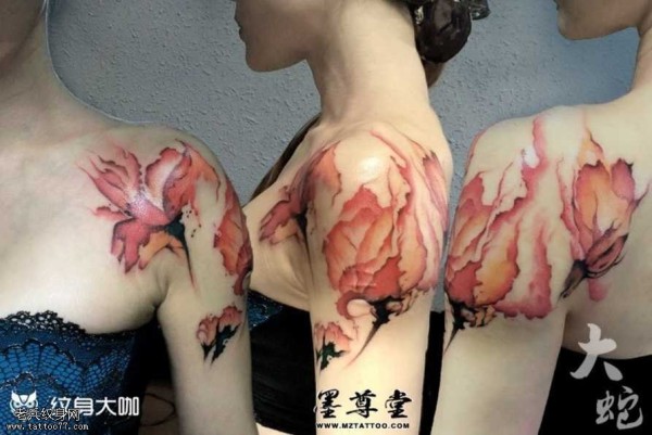 女生肩花纹身_15张女性双肩对称的肩花纹身图案作品图片
