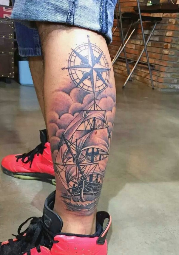 包小腿帅气的黑灰帆船纹身图案