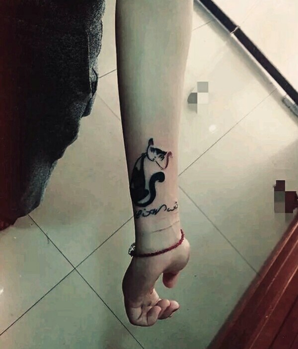 手臂日式小黑猫纹身图案简单大方