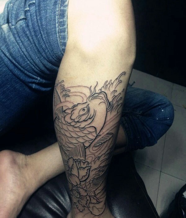 传统鲤鱼花小腿纹身_腿部纹身图案大全_纹身图吧