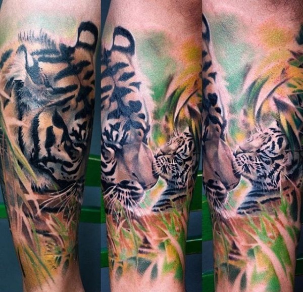 帅气的彩色花腿纹身水墨画纹身图案