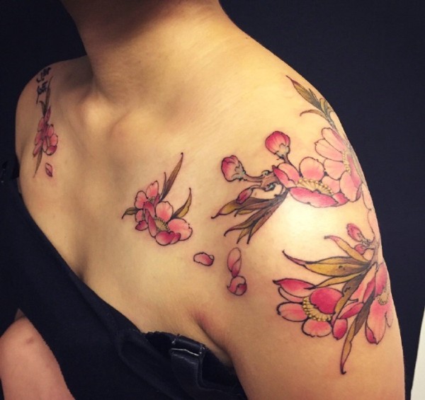 女性肩膀上多款漂亮的花朵纹身图案