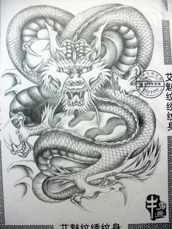 龙纹身手稿_一组老传统黑灰龙手稿纹身图案