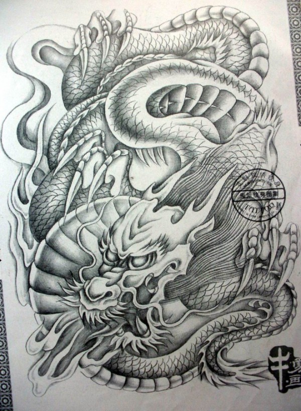 龙纹身手稿_一组老传统黑灰龙手稿纹身图案