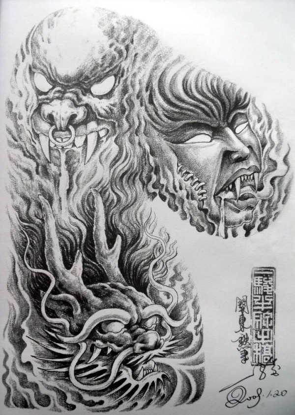 龙纹身手稿_一组老传统黑灰龙手稿纹身图案