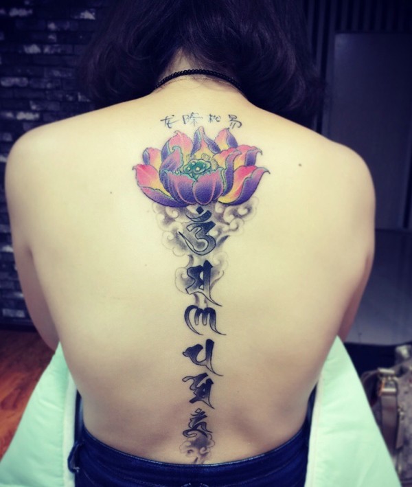 彩色莲花与梵文结合的脊椎部纹身图案