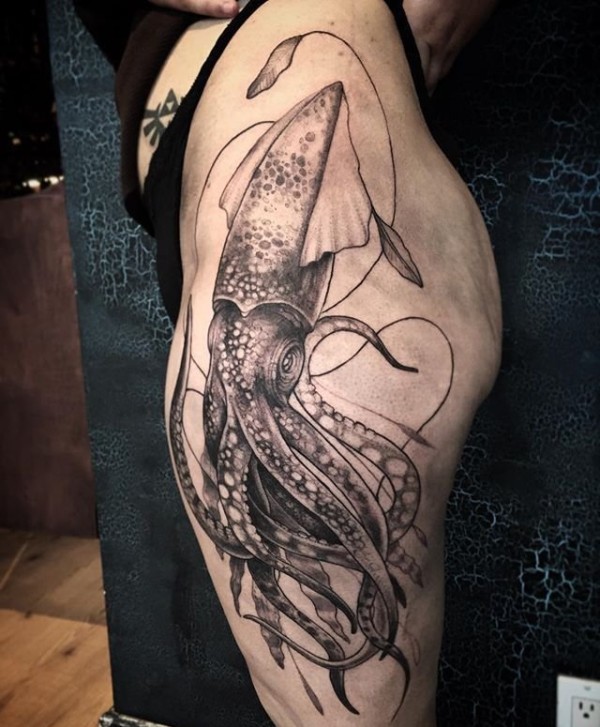 女子侧腰至臀部大鱿鱼纹身图案