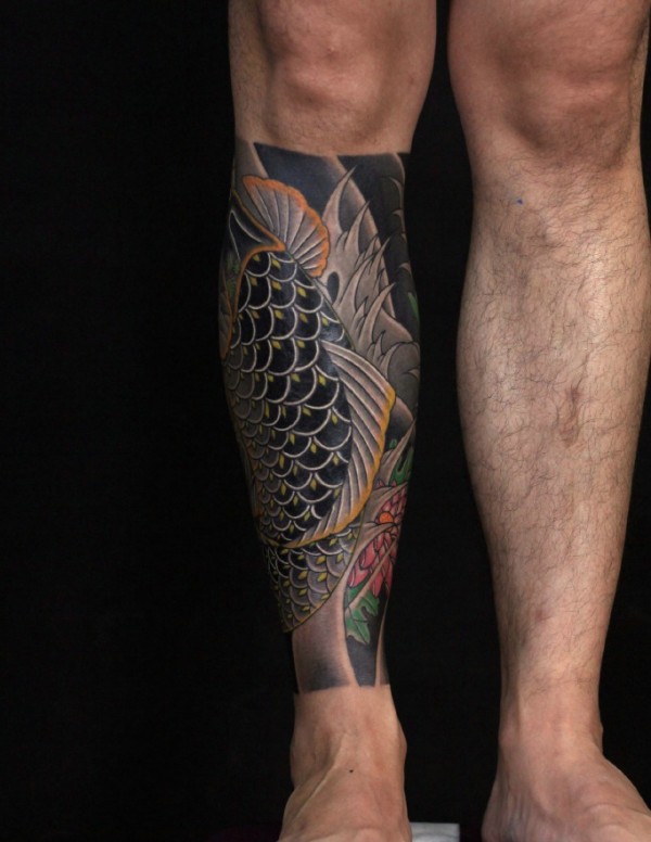 传统鲤鱼花小腿纹身_腿部纹身图案大全_纹身图吧