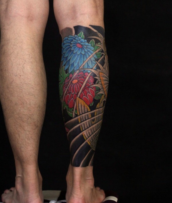传统鲤鱼花小腿纹身_腿部纹身图案大全_纹身图吧