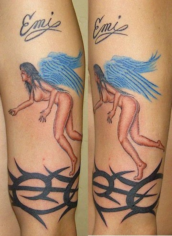 手臂臂环纹身和赤裸天使,蓝色羽翼