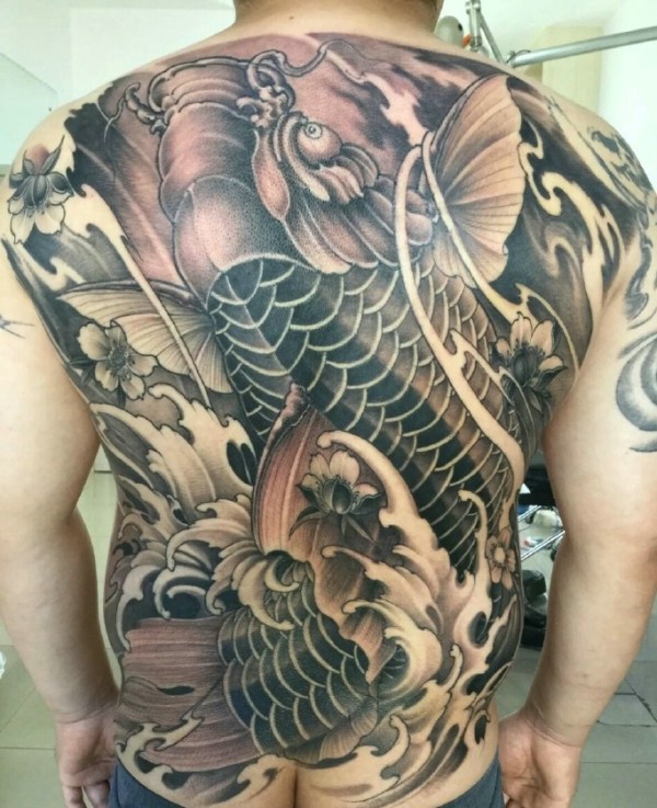 遮盖满背完美的黑白大鲤鱼纹身图案