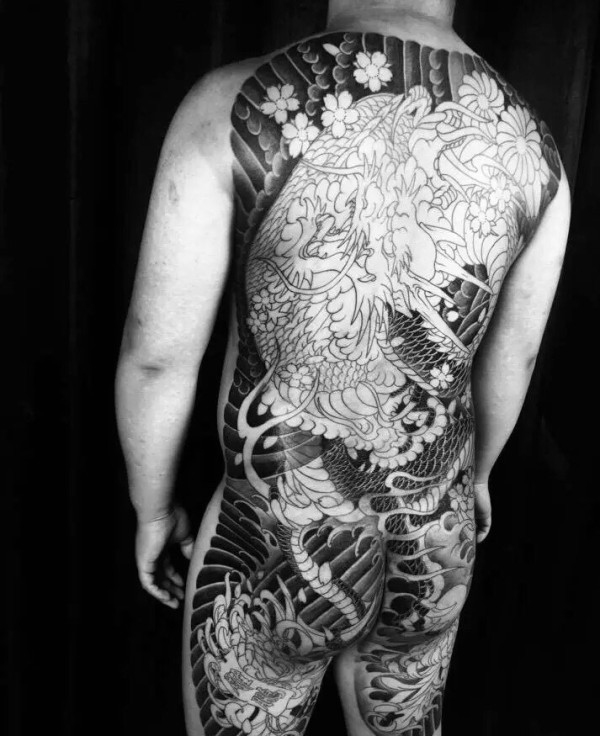 满背黑白传统大邪龙纹身图案