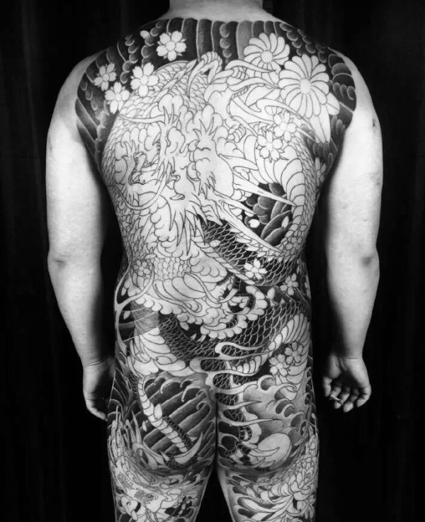 满背黑白传统大邪龙纹身图案