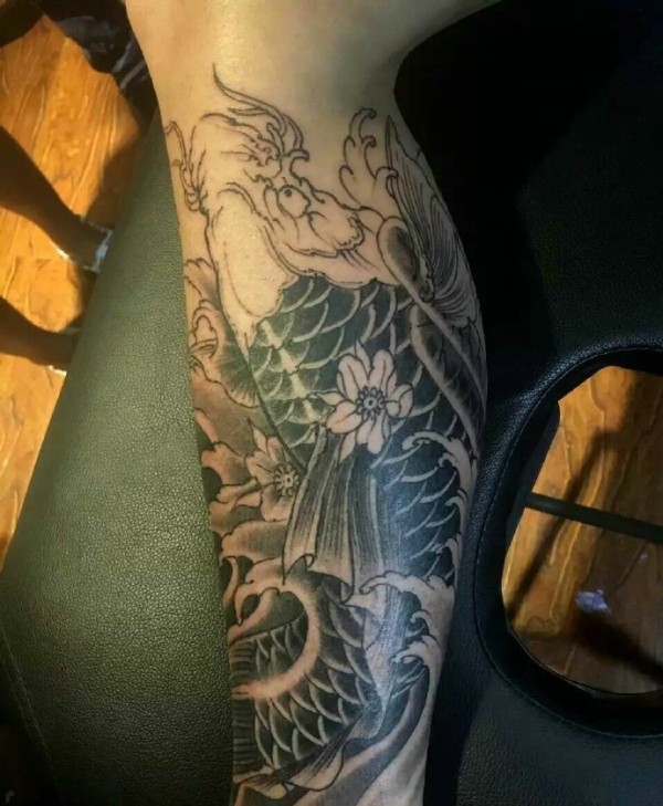 小腿部黑白传统鲤鱼纹身图案