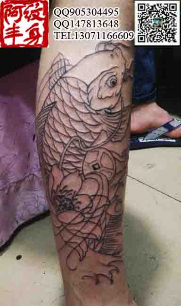 腿部纹身图案-腿部线条鱼纹身-丰台纹身-阿丰纹身店QQ微信147813648
