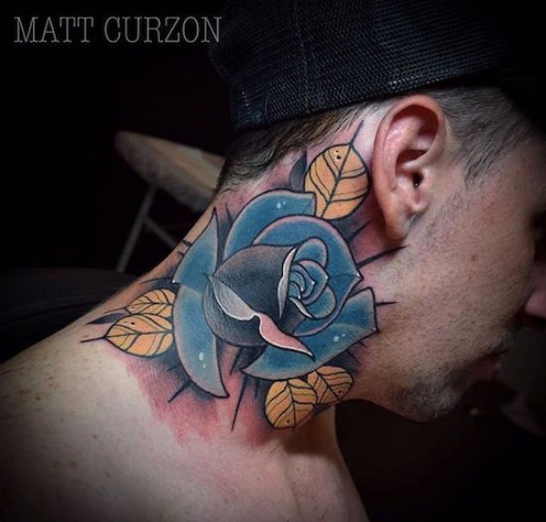 脖子纹身蓝色玫瑰花纹身图案