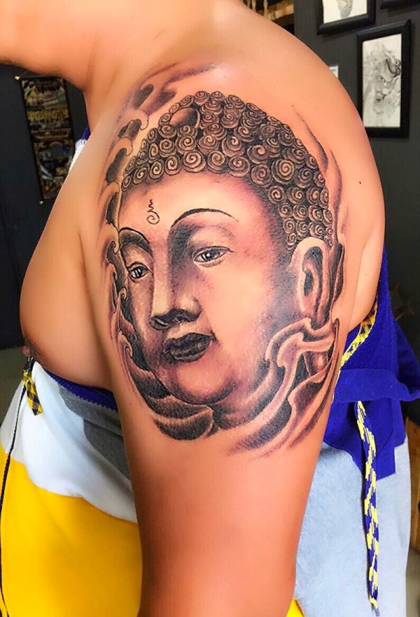 大臂经典的佛头纹身图案很帅气