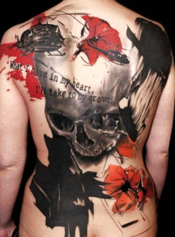 满背水彩个性骷髅纹身图案很狂野