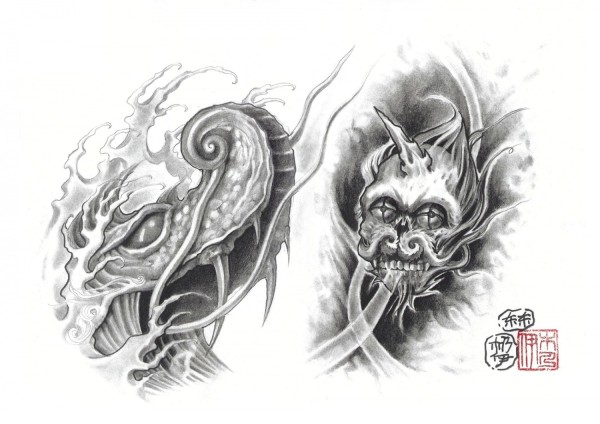 龙纹身手稿_一组老传统黑灰龙手稿纹身图案