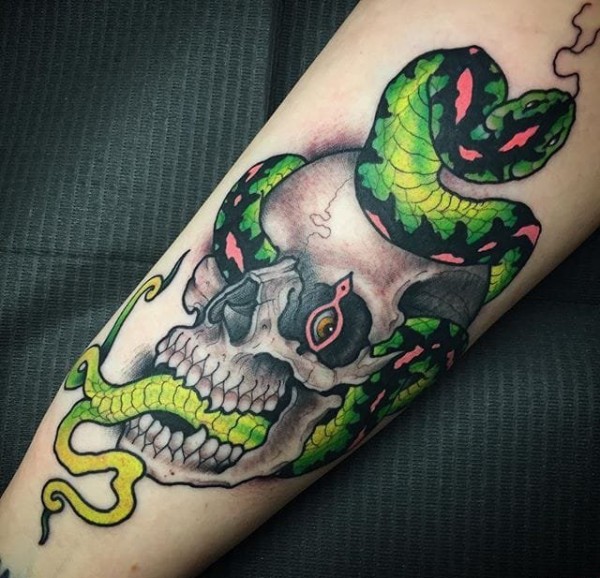 超帅时尚的黑灰骷髅与蛇纹身图案