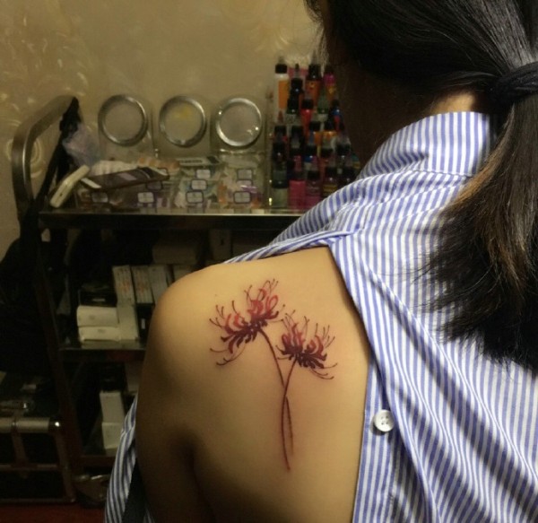 女生肩花纹身_15张女性双肩对称的肩花纹身图案作品图片