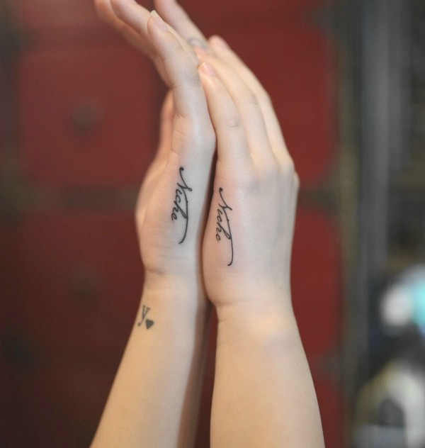 手掌侧边上的小清新英文情侣纹身图案