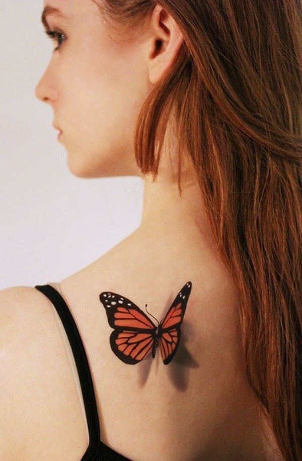 女性肩膀上漂亮的3D蝴蝶纹身图片