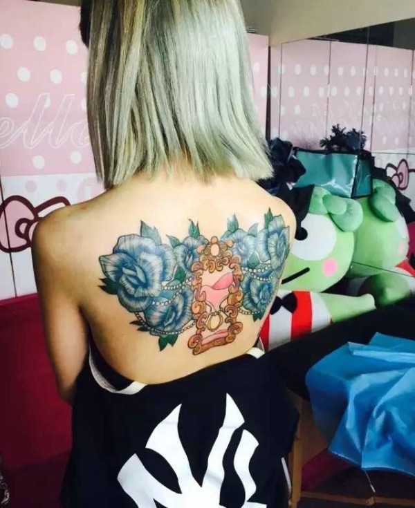 短发女孩后背彩色图腾纹身刺青