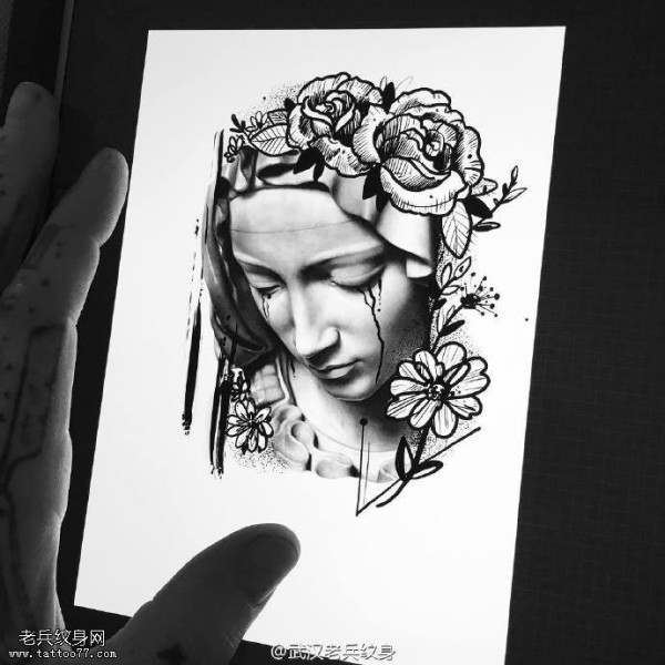 推荐一款欧美圣母玫瑰花纹身手稿素材