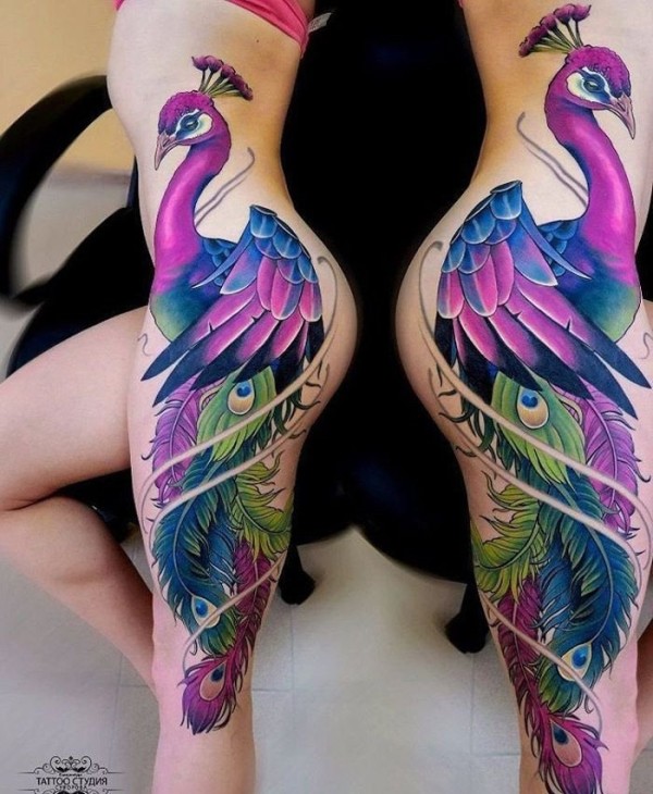 女子侧身超级漂亮的彩色孔雀纹身图案