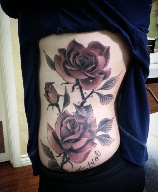 女子左侧肋上的大面积玫瑰花朵纹身图案