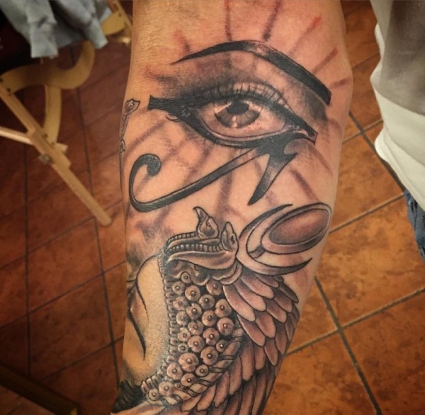 右手臂上的黑灰色荷鲁斯之眼和埃及风格头饰纹身图案
