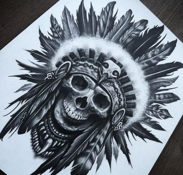 帅气的印第安狼头骷髅骨架纹身图案手稿