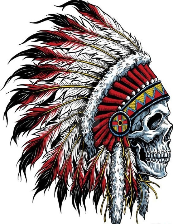 帅气的印第安狼头骷髅骨架纹身图案手稿