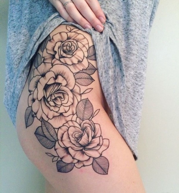 性感女人右侧臀部上精致的玫瑰花纹身图案