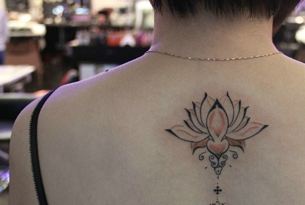 脊椎部上方的时尚莲花纹身图案